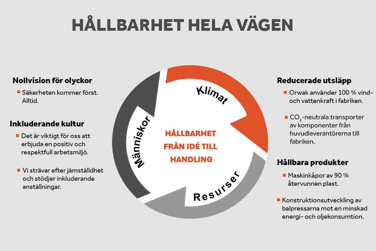 När du väljer en Orwaklösning, investerar du i en maskin som tillverkats med 100 % grön el. För att gå från tanke till handling, var det ett naturligt val för oss att välja el från förnyelsebara energikällor i Sverige när vi tillverkar våra balpressar.