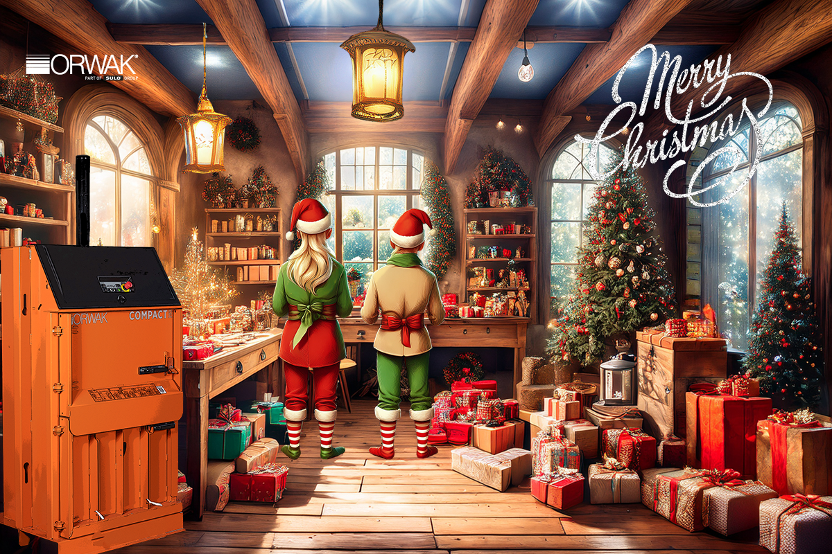 Lagringsutrymmet i verkstaden är högst begränsat och reserverat för säckarna med julklappar, men lyckligtvis har tomten en liten kompakt balpress som effektivt håller kartongerna i schack och komprimerar allt förpackningsavfall.